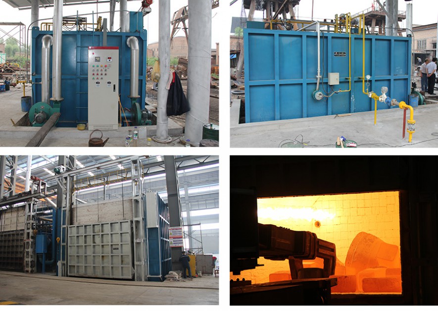 蓄熱式天然氣節能鍛造爐爐底單位鋼錠放在爐底上面的耐熱鋼滑道上,由設置在裝面積產量約為250一400kg/(mZ·h),單位熱耗約為料端的推鋼機向出料方向推進,加熱好的鋼錠多數由4.0~5.SGJ/t。設置在出料端側面的出鋼機推出爐外。推、出鋼機的推臺車式鍛造爐用于重型鋼錠的鍛前加熱。爐料力按摩擦系數為1.。計算。由吊車或專用機械裝在臺車上面的墊鐵上,墊鐵高度爐底單位面積產量約為15。